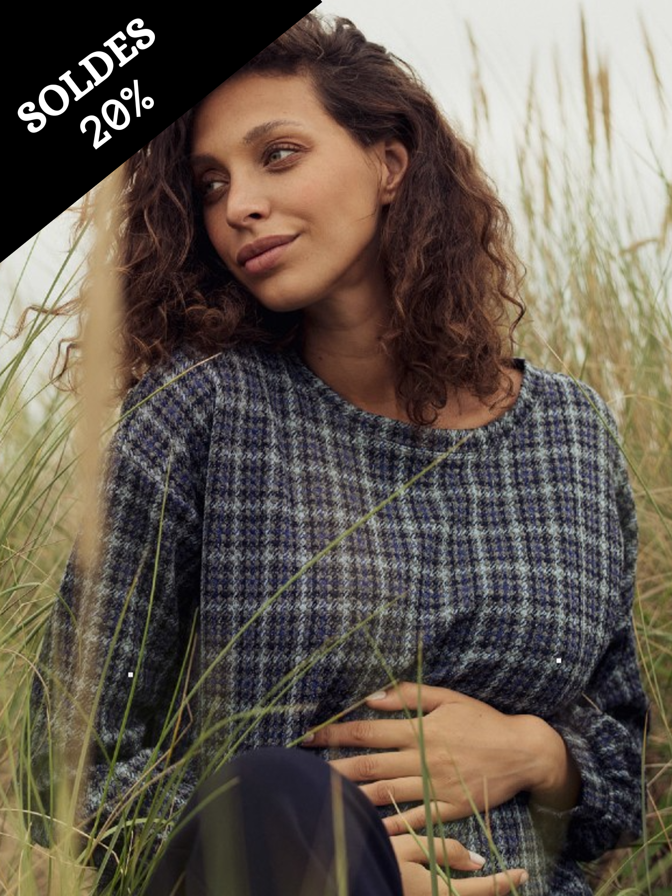 Pull de grossesse large bleu bouclé fabriqué en Belgique. Vous pourrez porter ce pull après la grossesse comme pull plus ample.