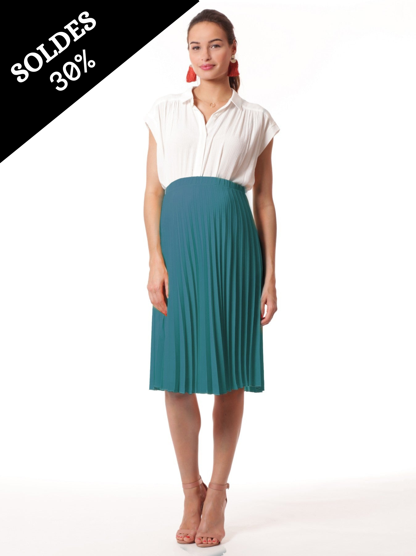Jupe de grossesse plissée Charlotte de couleur émeraude, une pièce élégante à porter aussi bien pour vos événements festifs que pour le quotidien !