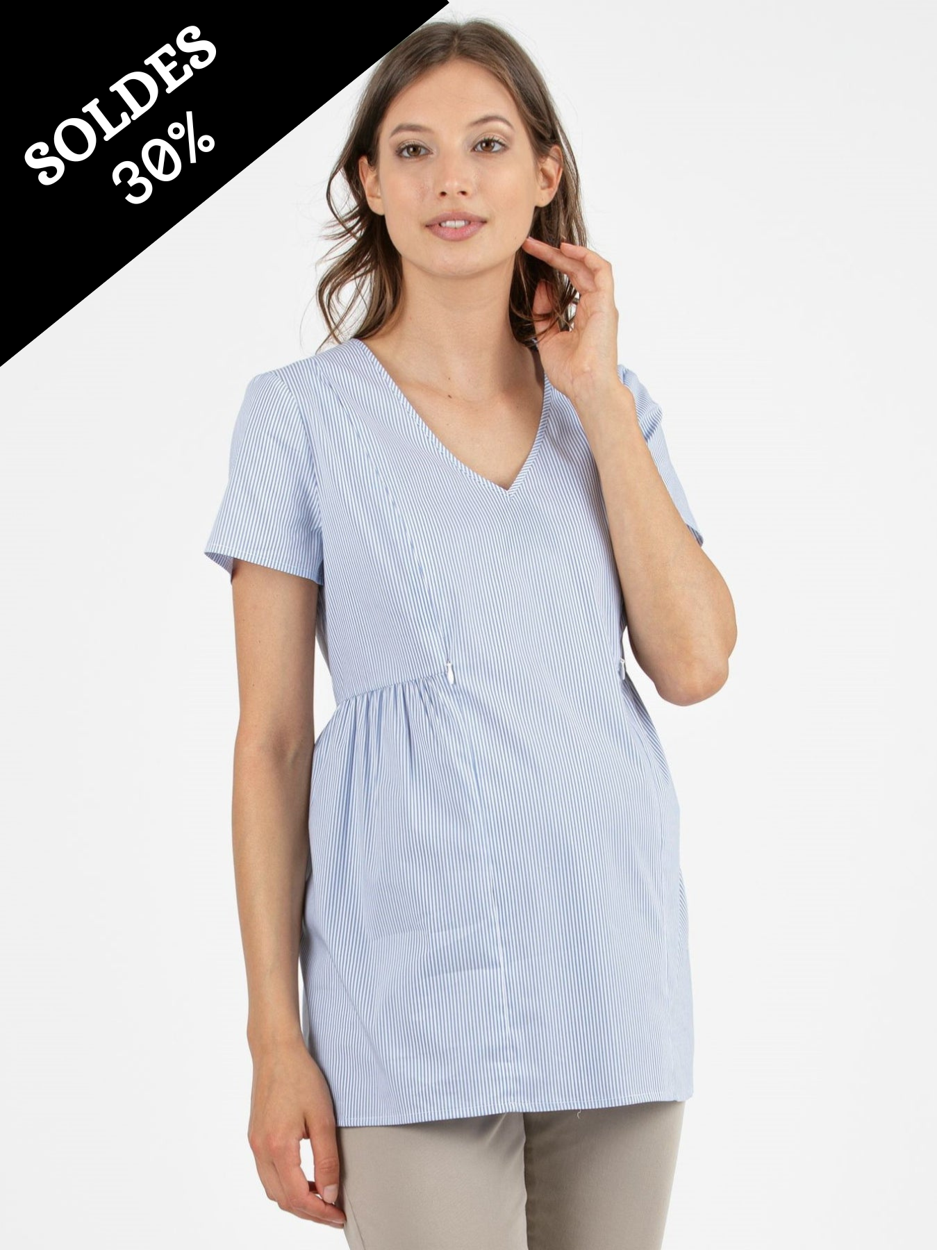 Blouse de grossesse et d'allaitement en popeline de coton à rayures.