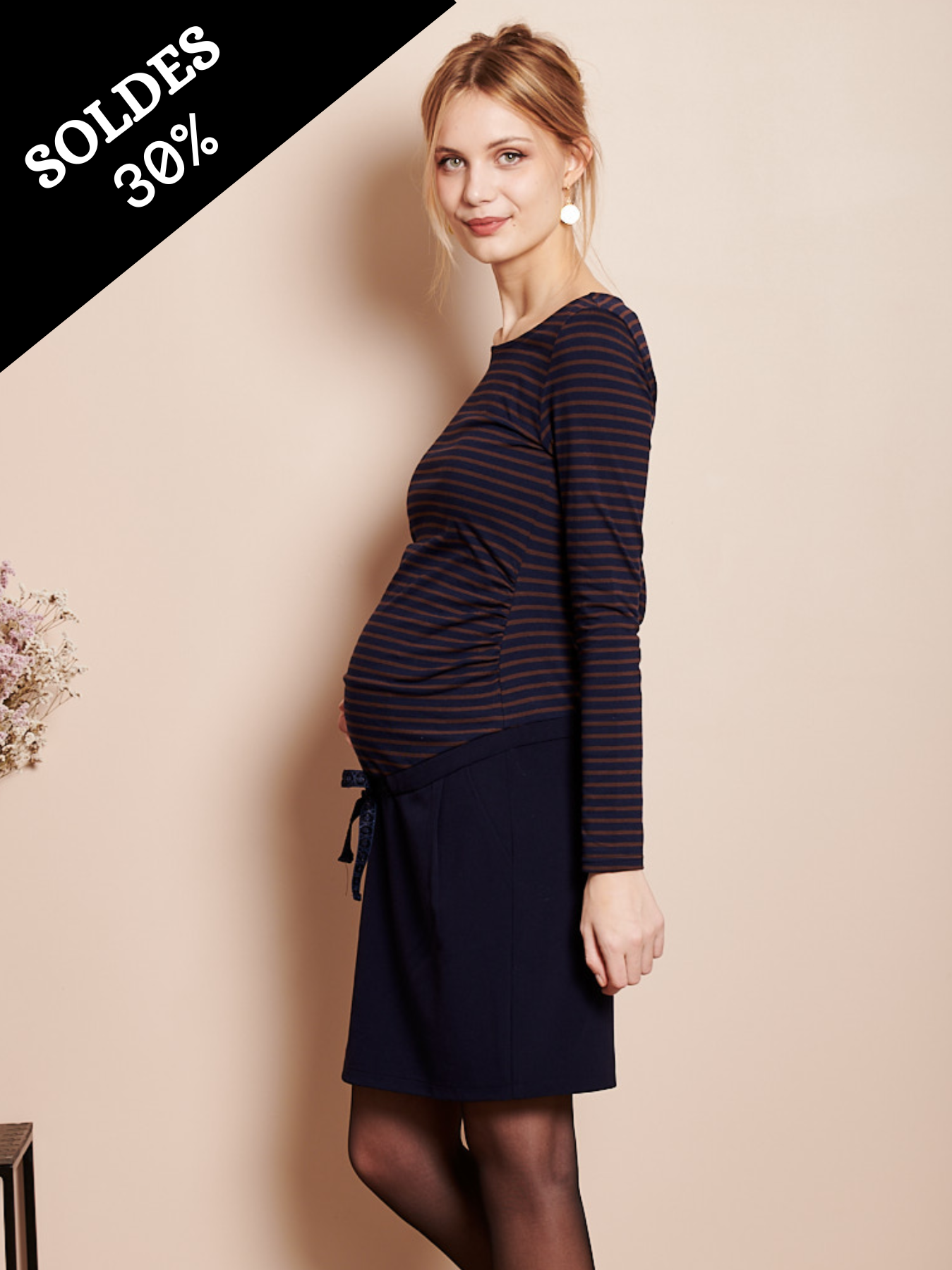 La robe de grossesse bi-matière rayée mettra parfaitement en évidence votre petit ventre rond au fil des mois.