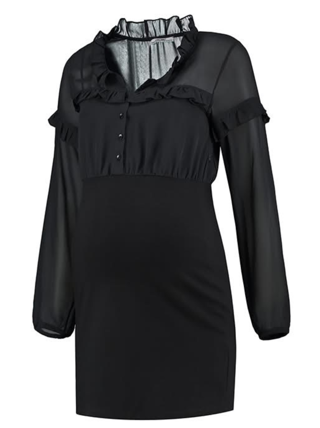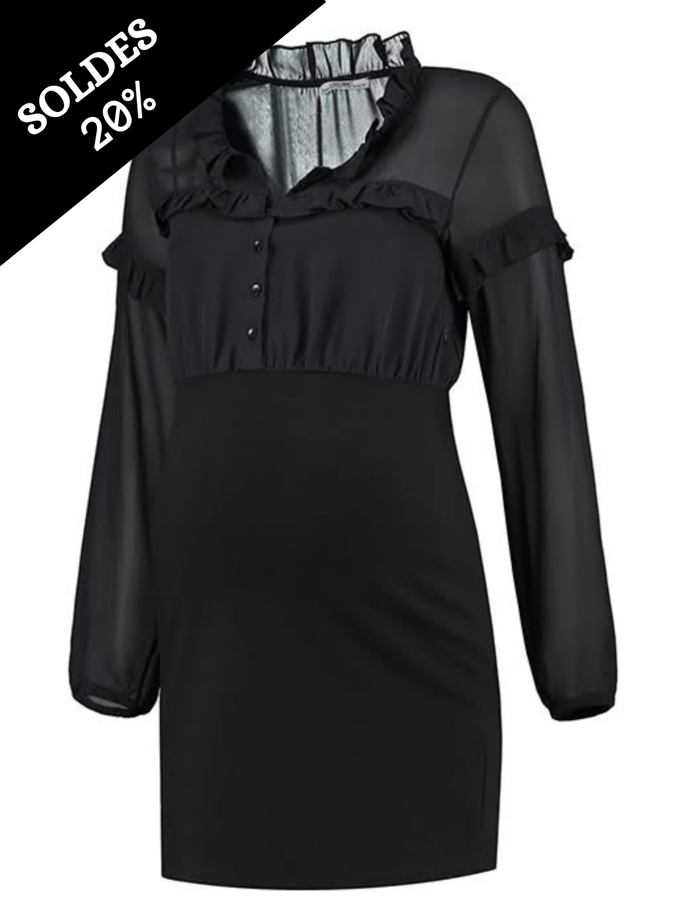Cette robe noire de grossesse incarne parfaitement l’élégance discrète et moderne. Avec son décolleté transparent délicatement boutonné, elle joue sur les contrastes : féminine, un brin audacieuse, mais toujours raffinée. Sa coupe est pensée pour sublimer toutes les silhouettes, pendant la grossesse… et longtemps après.