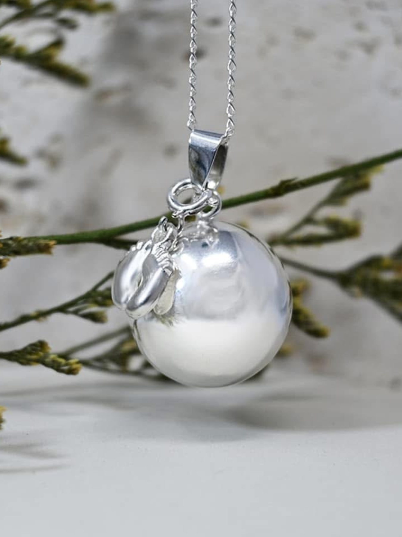 Elégant bola de grossesse fabriqué en France avec un petit pieds accrochée.