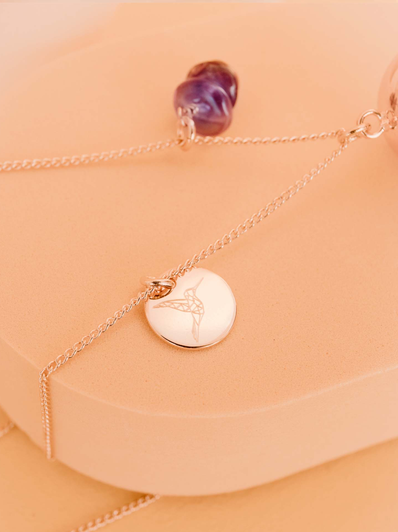 Ce modèle délicat est accompagné de trois pierres d’améthyste et d’un médaillon avec un colibri gravé.