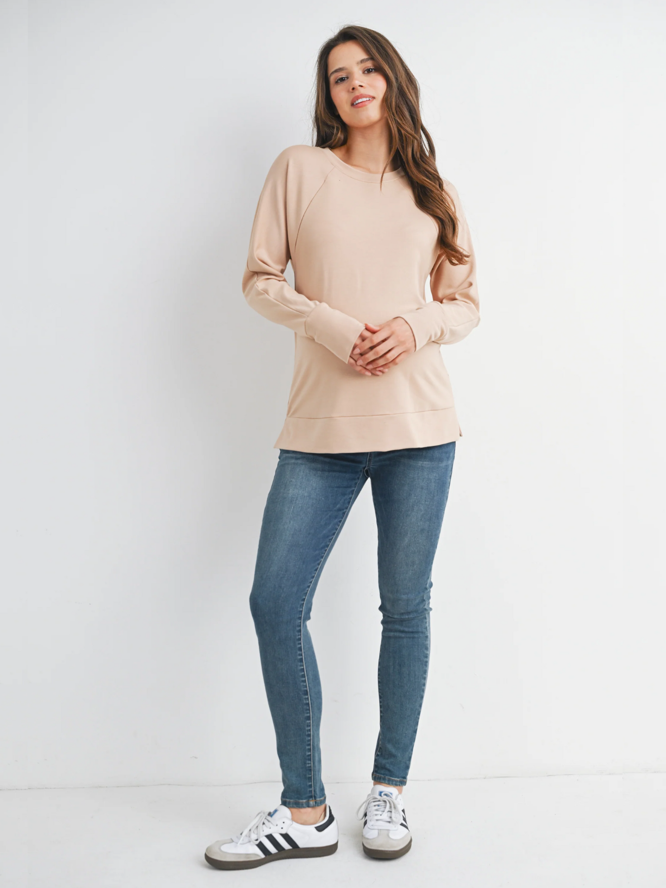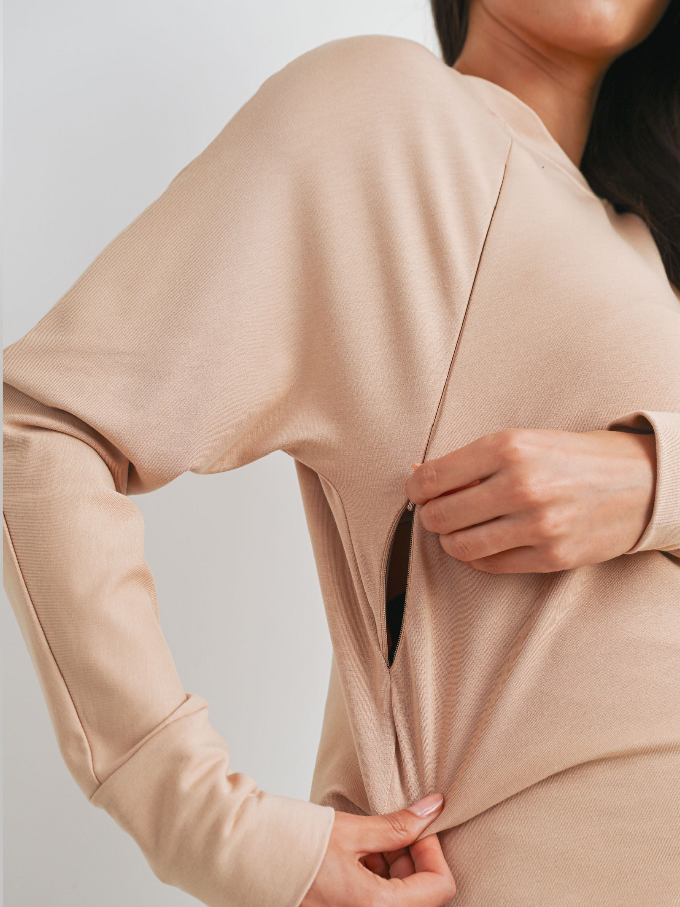 Sweater beige adapté à la grossesse et à l'allaitement de couleur beige. Ce haut polyvalent avec une texture velouté toute douce deviendra rapidement la pièce incontournable de votre dressing.